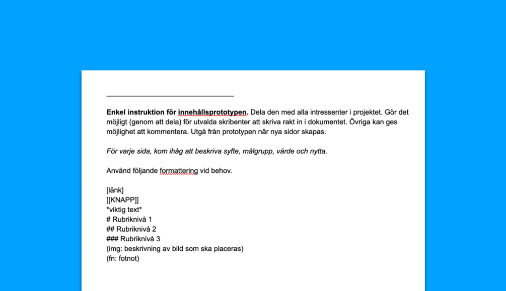 Länk till en mall för att arbeta med innehållsprototyper i Google Docs. Du får även nedladdningsbara versioner i Microsoft Word, RTF och ODT-format.